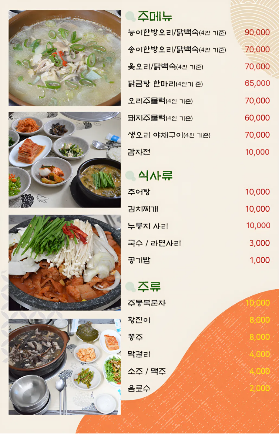 송해와오리백숙 | 전북 남원시 대산면 운교2길 24 | TEL : 063-636-1450 | 사업자번호 : 407-06-25941 | 대표자 : 이상남