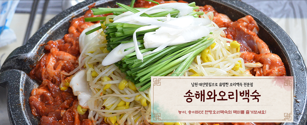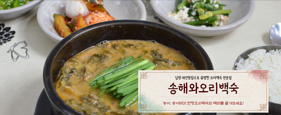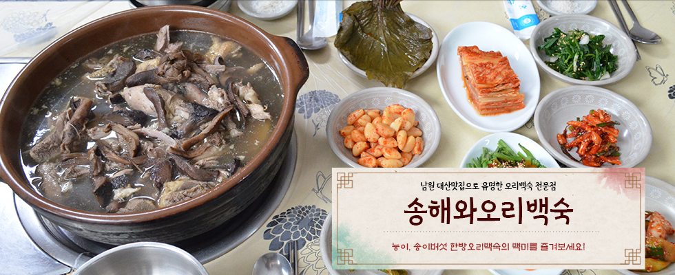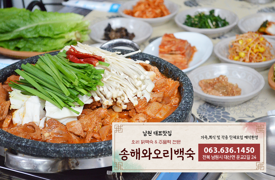 송해와오리백숙 | 전북 남원시 대산면 운교2길 24 | TEL : 063-636-1450 | 사업자번호 : 407-06-25941 | 대표자 : 이상남